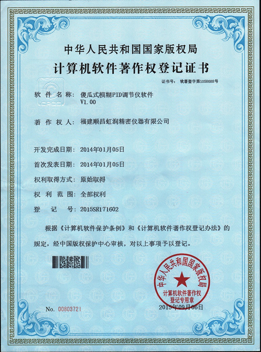 虹潤(rùn)公司人工智能算式與模糊PID算式是虹潤(rùn)公司應(yīng)用自主知識(shí)產(chǎn)權(quán)開(kāi)發(fā)的新一代智能溫控儀表,產(chǎn)品榮獲一種人工智能調(diào)節(jié)器及其調(diào)節(jié)方法(專利號(hào):2016107742425)、模糊PID控制儀及控制方法(專利號(hào)2015109378814)、一種智能化控制器及自整定方法(專利號(hào)2016103155465)、閥門自動(dòng)、手動(dòng)無(wú)擾動(dòng)操作控制方法及裝置(專利號(hào)2007101540083)4項(xiàng)國(guó)家發(fā)明專利,NHR人工智能模糊PID調(diào)節(jié)器(版權(quán)登記號(hào)2009SR044371)傻瓜式模糊PID調(diào)節(jié)儀軟件V1.00 (版權(quán)登記號(hào)2015SR171602)2項(xiàng)軟件著作權(quán)。