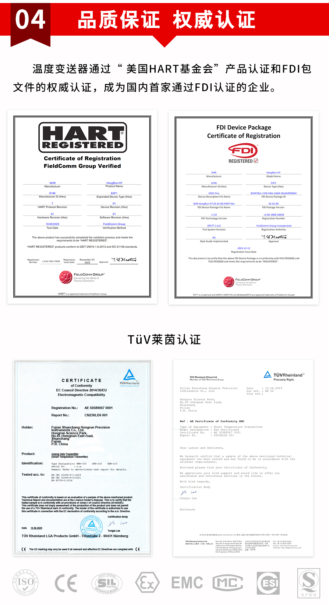 虹潤公司是專業(yè)生產(chǎn)溫度變送器的國家專精特新“小巨人”企業(yè)。生產(chǎn)的智能溫度變送器,具有適配各類溫度傳感器,精度高,通過編程線修改輸入信號(hào)類型及量程,高抗干擾,HART或485通訊等特點(diǎn)。該產(chǎn)品不僅通過HART基金會(huì)認(rèn)證、德國萊茵 CE 認(rèn)證與 SIL 功能安全認(rèn)證,還獲得具備減震抗干擾能力的溫度變送器、信號(hào)隔離器、一種二端子模塊、無源信號(hào)隔離器等4項(xiàng)國家發(fā)明專利,主持起草物聯(lián)網(wǎng)智能溫度儀表、現(xiàn)場設(shè)備工具(FDT)接口規(guī)范、工業(yè)過程測(cè)量和控制系統(tǒng)用溫度變送器等3項(xiàng)國家標(biāo)準(zhǔn),以及通信系統(tǒng)多通道數(shù)據(jù)采集控制終端規(guī)范軍用標(biāo)準(zhǔn),參與國際5G標(biāo)準(zhǔn)制定,取得HART溫度變送器、智能溫度變送器等3項(xiàng)相關(guān)軟件著作權(quán)。產(chǎn)品廣泛應(yīng)用于石油、化工、電力、冶金、制藥、食品、水處理等各種工業(yè)領(lǐng)域。
